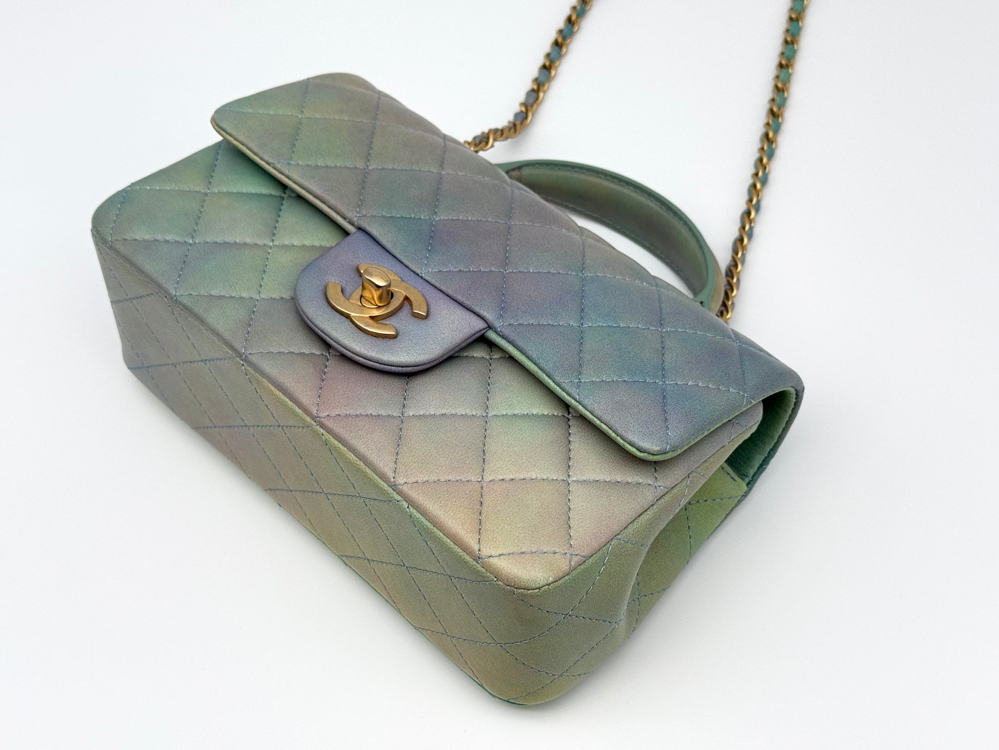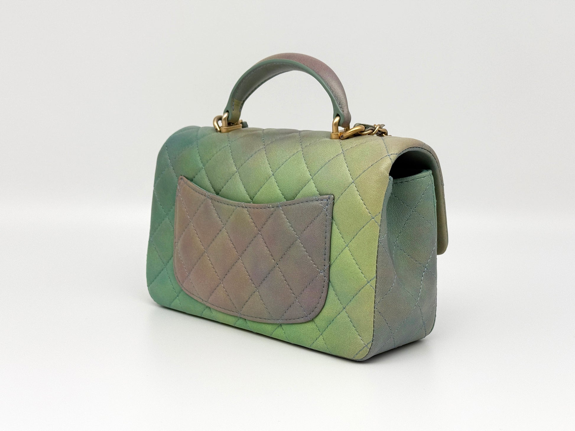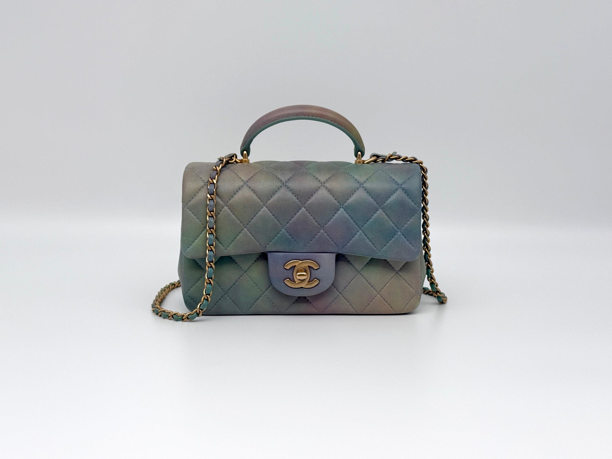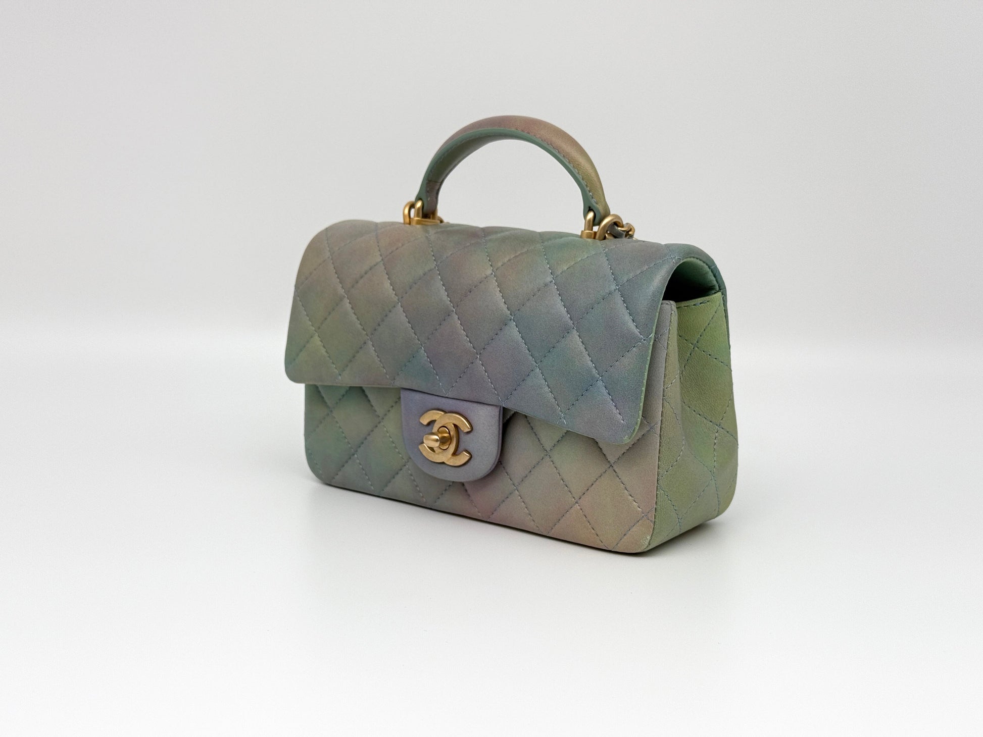 The Top Handle variant of the Classic Mini Flap handbag is an even more versatile version of Chanel’s most popular handbag, which can be worn on the shoulder, crossbody, or handheld with the handle. These have very long waiting lists which are virtually impossible to purchase in-store. This particular colour is absolutely stunning and was very sought after, being a unique shade for the Spring/Summer Act 1 (Printemps) collection of 2022, complemented beautifully by the Aged Gold Hardware to give a great contrast. Please note that there are some mostly light rub marks on the corners of the bag and the flap, these are not easily noticeable from a distance and are inevitable with the bag's shape.