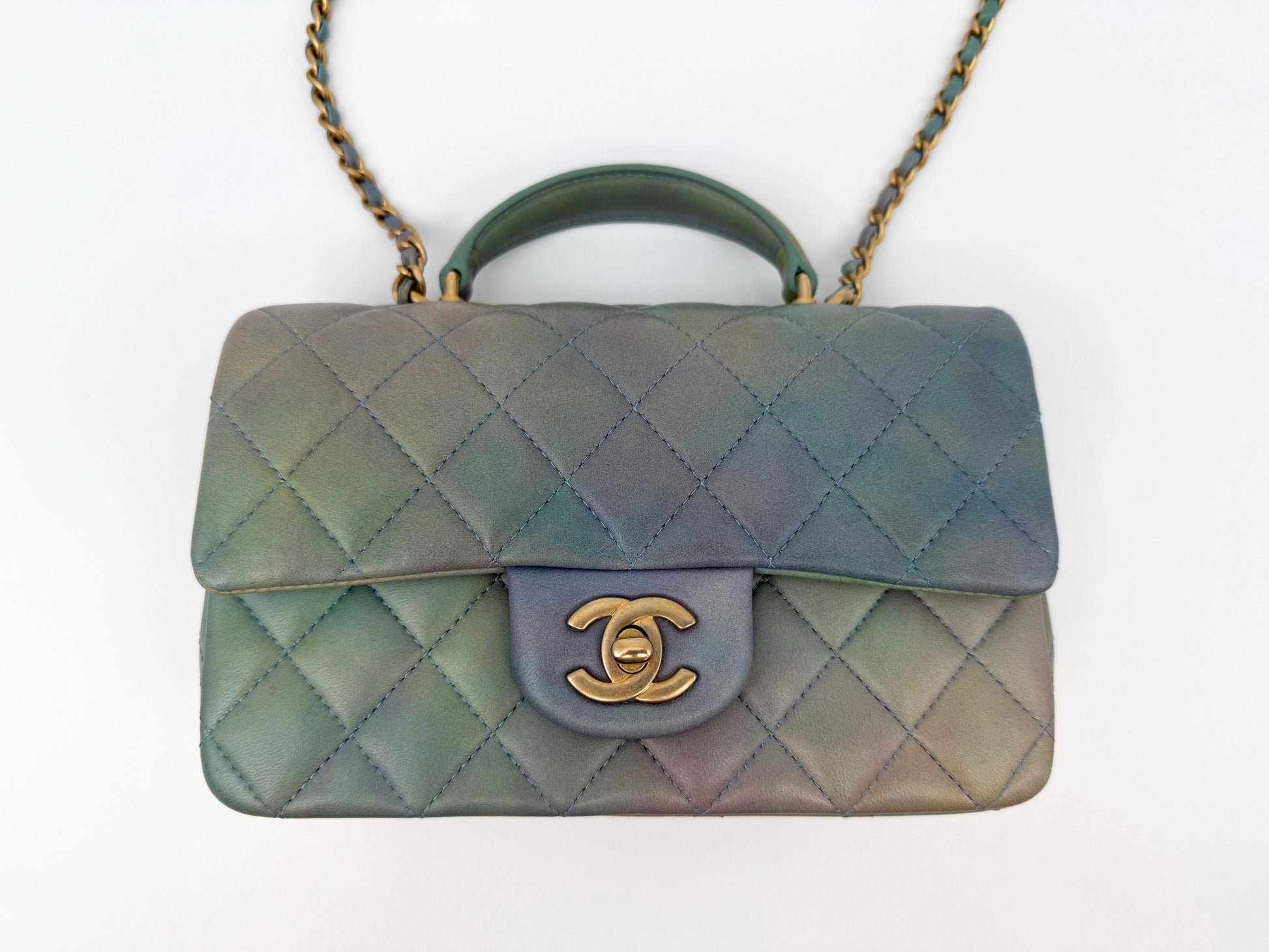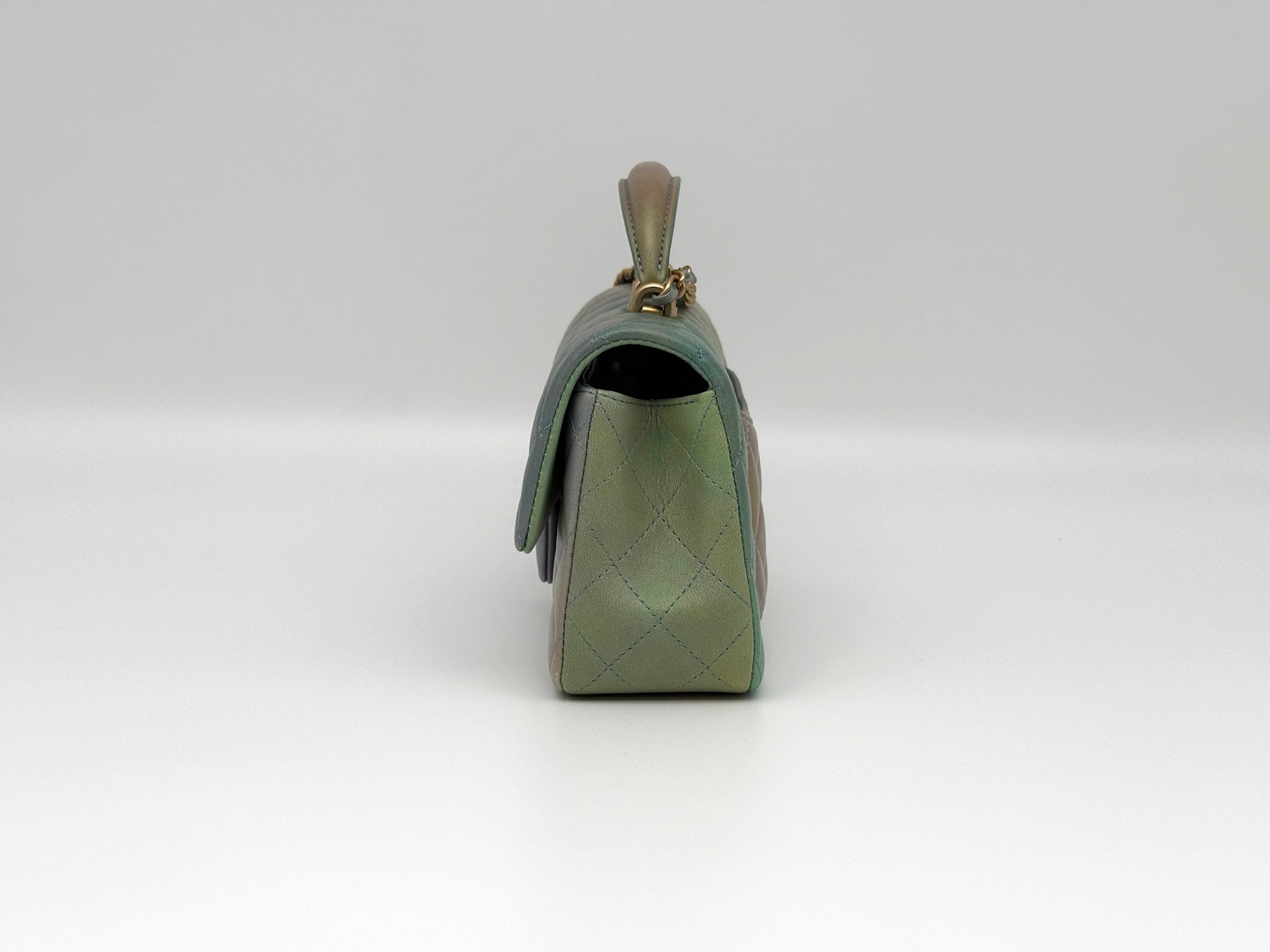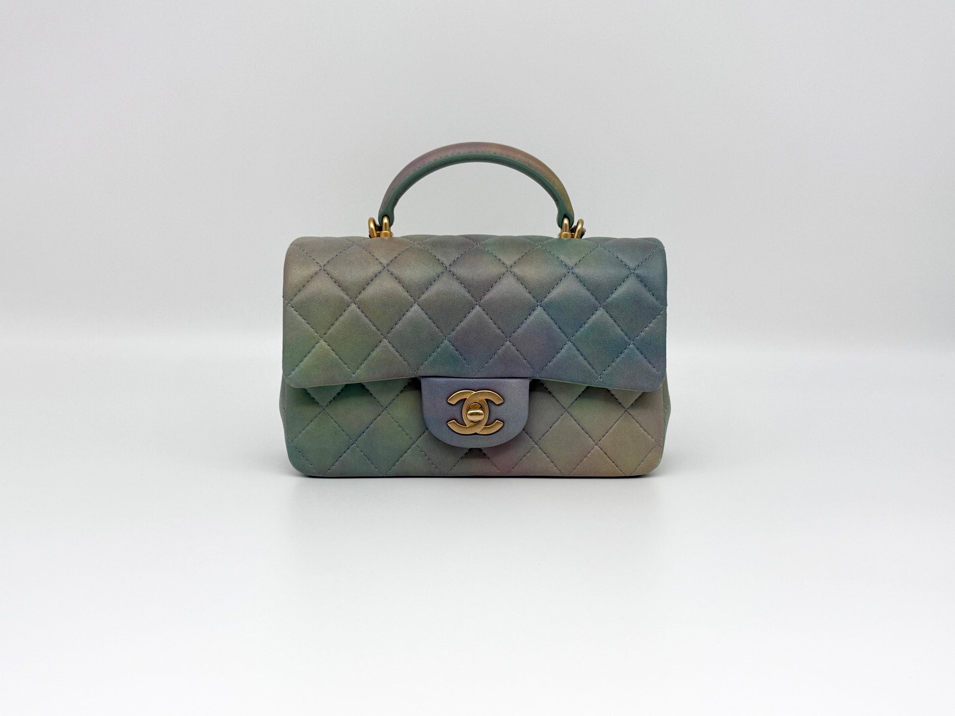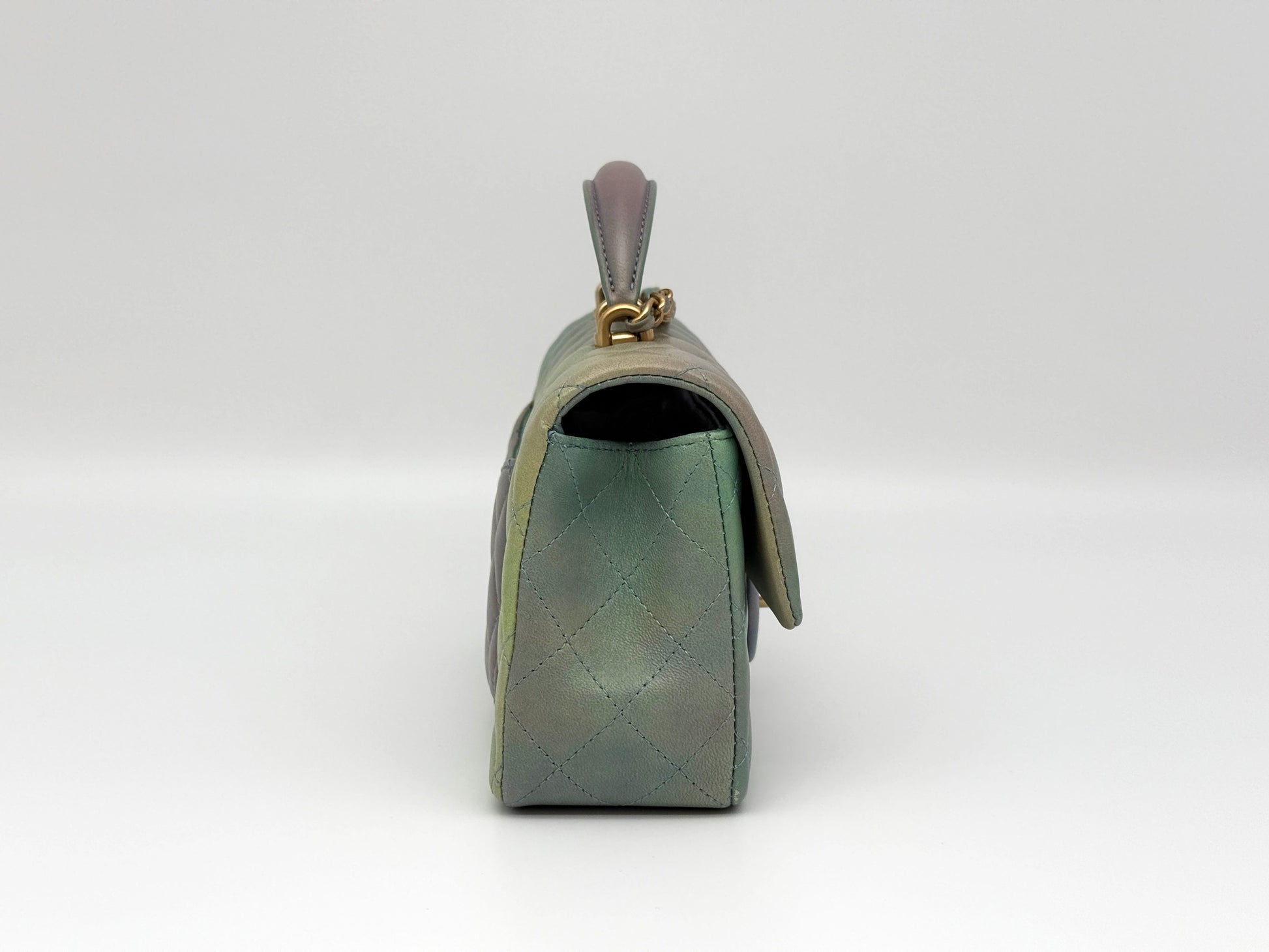 The Top Handle variant of the Classic Mini Flap handbag is an even more versatile version of Chanel’s most popular handbag, which can be worn on the shoulder, crossbody, or handheld with the handle. These have very long waiting lists which are virtually impossible to purchase in-store. This particular colour is absolutely stunning and was very sought after, being a unique shade for the Spring/Summer Act 1 (Printemps) collection of 2022, complemented beautifully by the Aged Gold Hardware to give a great contrast. Please note that there are some mostly light rub marks on the corners of the bag and the flap, these are not easily noticeable from a distance and are inevitable with the bag's shape.